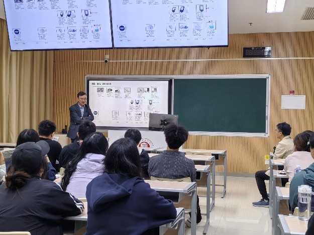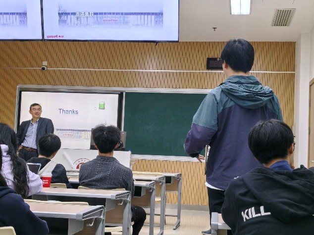 介绍结束后,现场进入互动交流环节,张亚南与在场师生围绕 CGM 系统、医疗行业职业发展路径、鱼跃凯立特实习机会等话题展开讨论。许多同学结合自身专业背景与兴趣方向举手提问。面对同学们的提问,张亚南博士保持耐心与热情,不仅从多个维度进行细致解答,还结合自身从业经历分享了医疗设备领域的发展机遇与成长经验。每一次解答都条理清晰、干货满满,既解答了同学们的疑惑,也为大家提供了切实的职业参考。