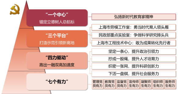 党支部提出“一三四七”工作思路,即围绕“一个中心”立德树人总航标,立足于上海市劳模工作室、民政部重点实验室与上海市工程技术中心“三个平台”,推进党建工作与业务发展深度融合,形成政治引领力、人才培育力、科研创新力和社会服务力提升的“四力驱动”局面,夯实党建基础,坚守育才初心,倡导服务奉献,创建党建品牌,对标争先,切实做到“七个有力”,在全力构建新发展格局、推进高质量发展的新征程上踔厉奋发,赓续前行。党支部在全国宝钢优秀教师、上海市劳模、国家重点研发计划项目首席专家喻洪流支部书记党带领下,开拓创新,荣获多项荣誉,包括:党支部入选全国高校党建工作样板党支部、上海市“党支部建设示范点”、上海市劳模创新工作室、教育部全国高校思想政治工作网党员先锋宣传典型、上海理工大学“双带头人”教师党支部工作室、先进基层党组织、卓越党支部等。