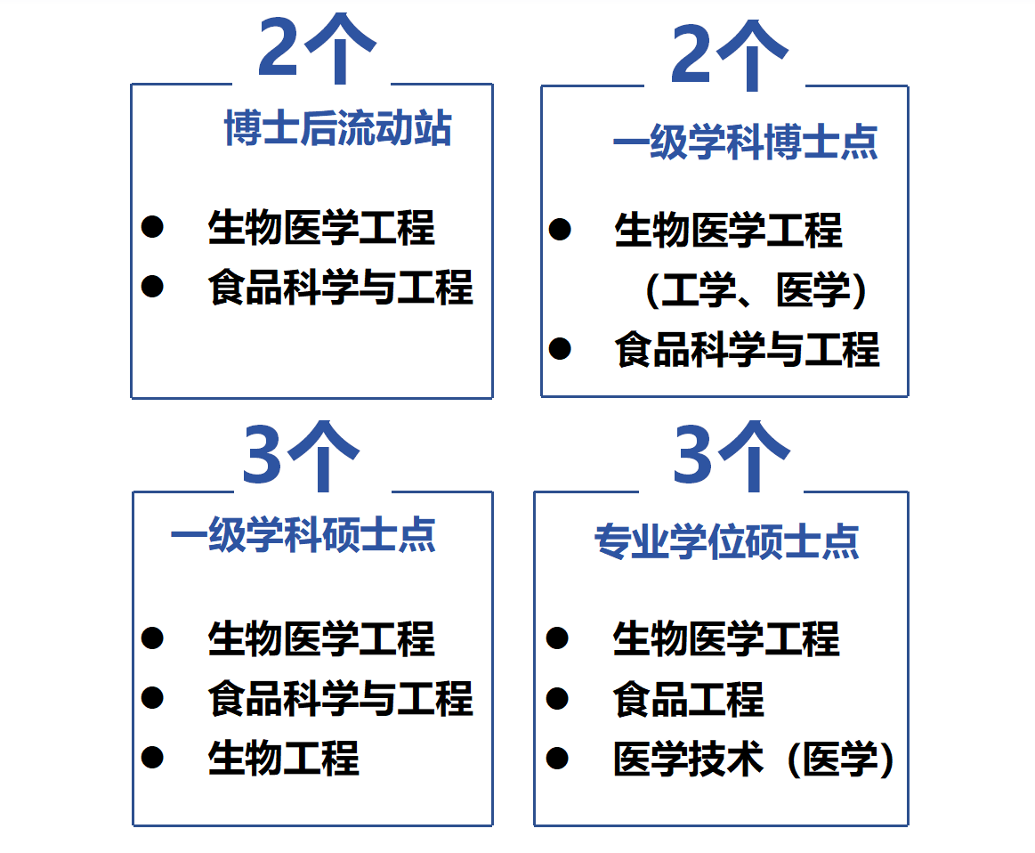 获批医学技术(医学)专硕点、生物工程一级学科硕士点,学院拥有2个一级学科博士点、3个一级学科硕士点、3个专业学位硕士点。注重专业学位研究生的实践能力培养,建立了多个实习实践基地,构建高效的实践教育教学模式。