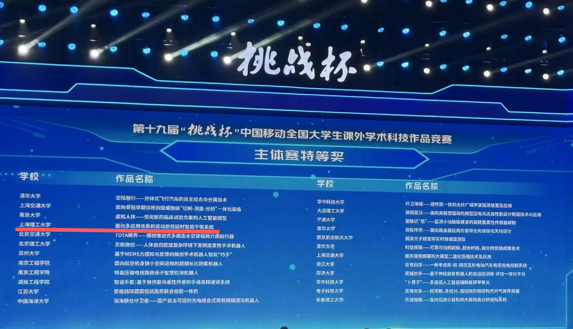2025年11月3日,第十九届“挑战杯”中国移动全国大学生课外学术科技作品竞赛终审决赛在南京大学仙林校区圆满落幕。上海理工大学健康科学与工程学院参赛项目《面向多应用场景的高动态低延时智能平衡系统》凭借其突出的创新性与应用价值,从全国顶尖高校作品中脱颖而出,荣获大赛最高荣誉——全国特等奖。这是健康学院继此前在“挑战杯”创业计划大赛、中国国际大学生创新大赛中屡获金奖后,在顶级国家级科创赛事中取得的又一重大突破,标志着学院科创育人工作迈上了新的台阶。