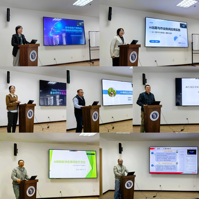 会上,医学人工智能系系主任何宏教授从专业建设层面出发,阐述了AI技术在课程体系优化中的关键作用,提出了面向未来医疗智能化需求的“医工交叉AI培养新模式”。林勇老师展示了AI工具在《离散数学》课程教案生成中的创新实践,分享了如何通过“扣子空间”“讯飞智文”等平台提升教案质量与思维导图设计。尹梓名老师介绍了基于低代码平台Dify开发AI教学问答助手的全过程,实现了课堂内外智能化教学支持。周雷老师展示了在《医学图像处理》课程中运用生成式AI开展案例构建的探索,为教学内容多模态化提供了新路径。朱林老师以《Python程序设计》课程为例,展示了AI插件“通义灵码”在编程教学可视化中的应用,显著提升了学生的代码理解与学习兴趣。任浩冉老师介绍了“Deep Research”在科研与教学融合中的新范式,对知识获取的智能化流程进行了深入分析。赵艳老师分享了AI在《信号与系统》课程出题与作业批阅中的实践经验,展示了AI赋能教学评估的高效性与可操作性。