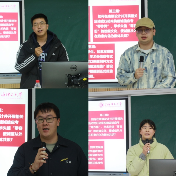 为帮助在场学生骨干将学习认知转化为实践能力,本次集体备课精心设置了分组专题研讨环节。与会骨干划分为五个小组,分别聚焦于“如何智慧拒绝并转化作弊请求”“如何识别与化解侥幸心理并提供学业支持”“如何设计行动以建设‘零作弊、零容忍’的班级诚信文化”等五个议题展开深度研讨。现场讨论气氛十分热烈,不同视角、不同思想不断碰撞,各小组成员在辅导员的引导下,结合身边实际,剖析问题根源、模拟应对场景、共商可行方案。随后由各小组代表充分展示小组研讨成果,从“友善而坚定”的拒绝话术到“学业帮扶小组”的运作设想,从诚信承诺书的想法到系统化劝阻不诚信行为的分级干预流程,小组代表们汇报了一系列兼具思想性与操作性的策略建议,这生动展现了学生骨干们从“知”到“行”的思考跃迁与实践智慧。