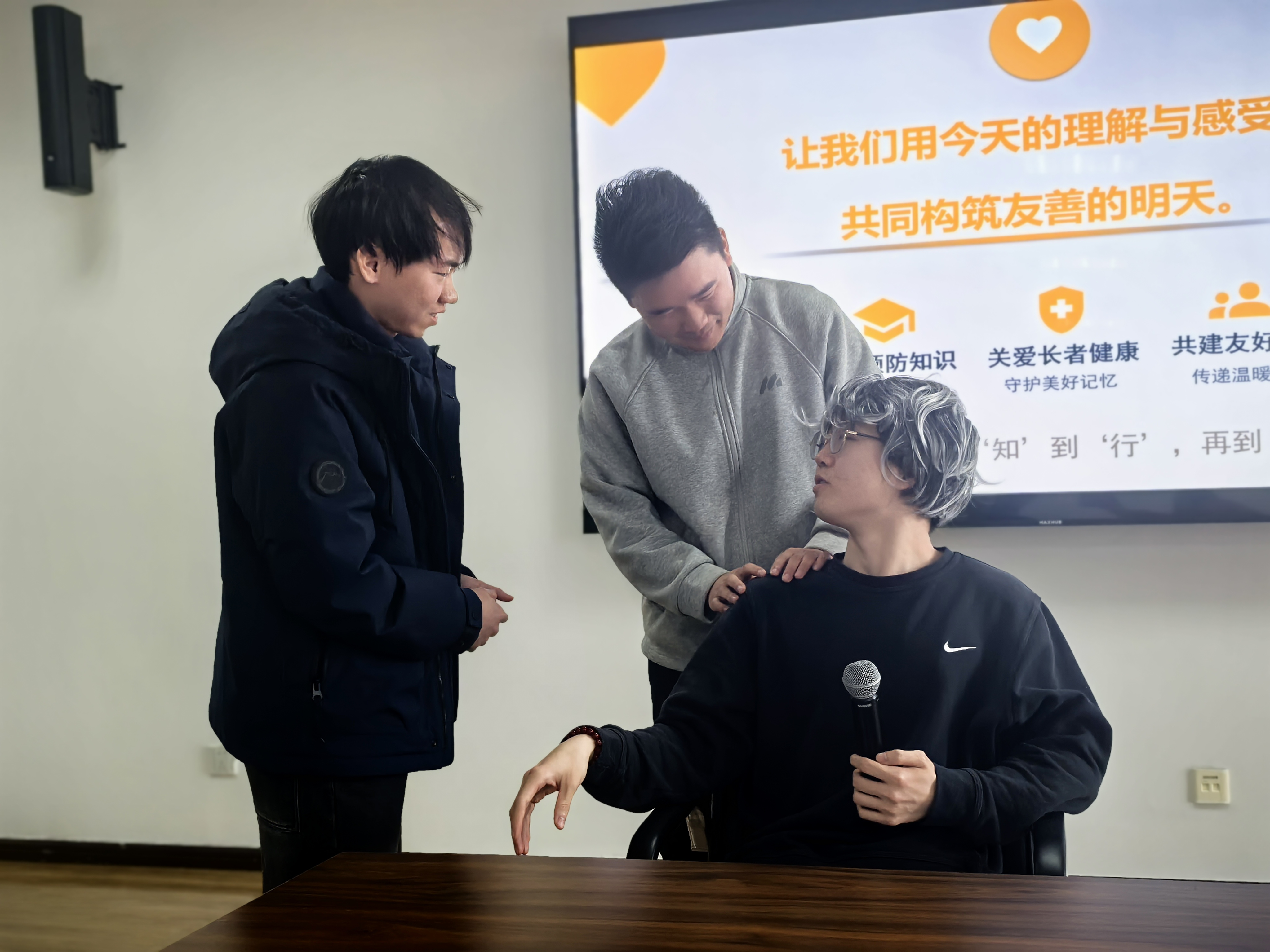 完成剧本创作后,与会党员分别代入认知症长者家属、社区工作者、医护人员及志愿者等多元角色,在精心搭建的模拟社区场景中,他们与由同学扮演的四类典型认知症NPC展开了即兴互动与情景演绎。面对具有“强迫性仪式行为”“日落综合症”“共病性沟通障碍”及“情感淡漠”等特征的长者角色,党员们亲身体验了日常照护中面临的沟通困境、身心压力与情感消耗。从起初尝试用逻辑说服,到逐渐学会运用非语言沟通;从习惯性地纠正错误,到学会理解并接纳“他们的现实”——参与者在互动中深刻感悟到,认知症照护不仅是一项专业技术,更是一门充满温度的艺术,其真谛在于“理解、行动与共情”的结合。