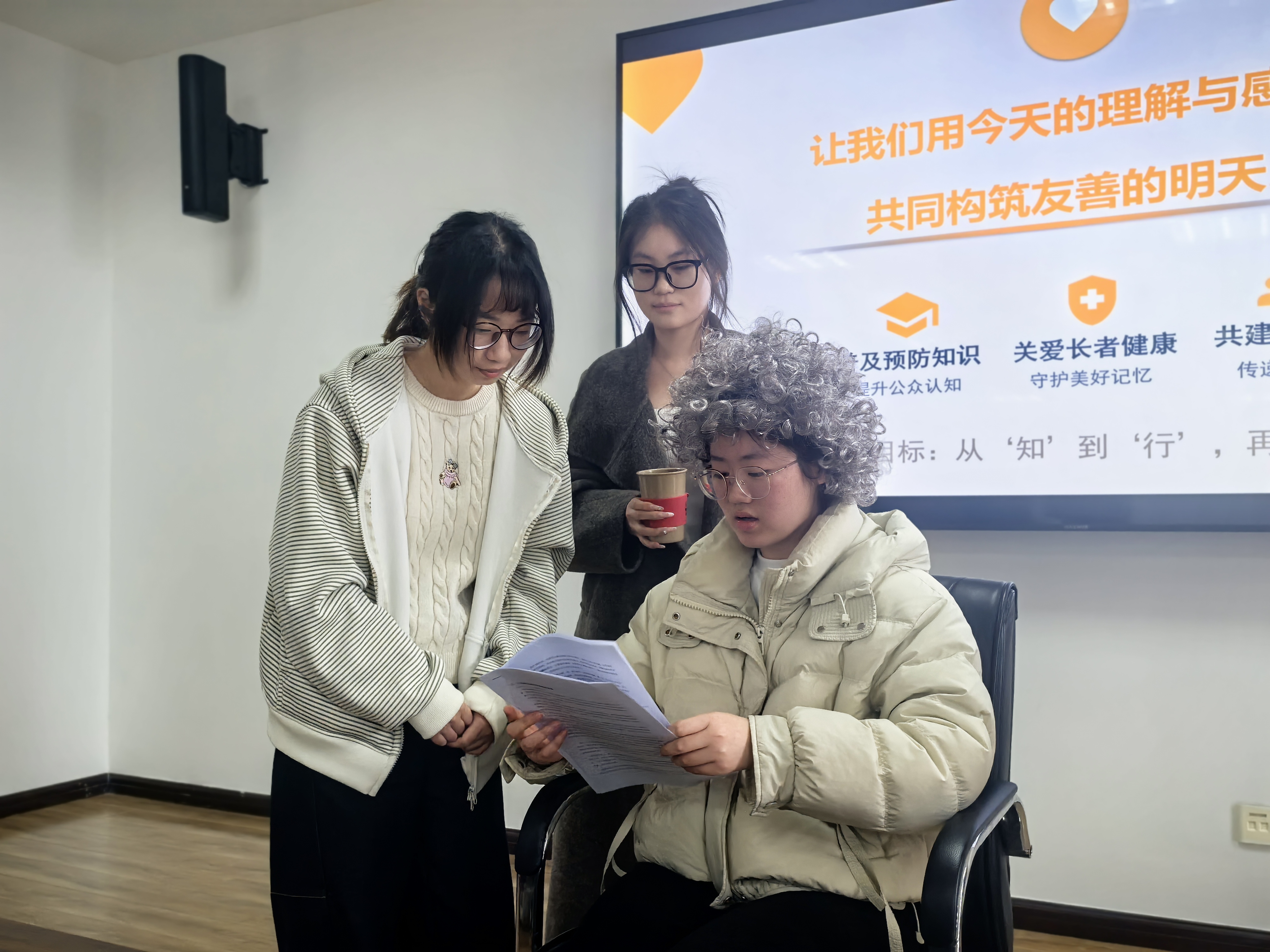 活动聚焦社会老龄化热点,开展了主题为“从‘痴呆’到‘知’爱”的沉浸式体验。在通过PPT系统讲解认知症的现状、早期征兆与社会影响之后,与会党员通过抽签分为四个小组,围绕认知症患者的日常生活场景展开剧本共创,结合前期所学知识展开热烈讨论,集思广益,在共同创作中也加深了对彼此的理解,进一步增进了支部党员的情感交流与支部凝聚力。